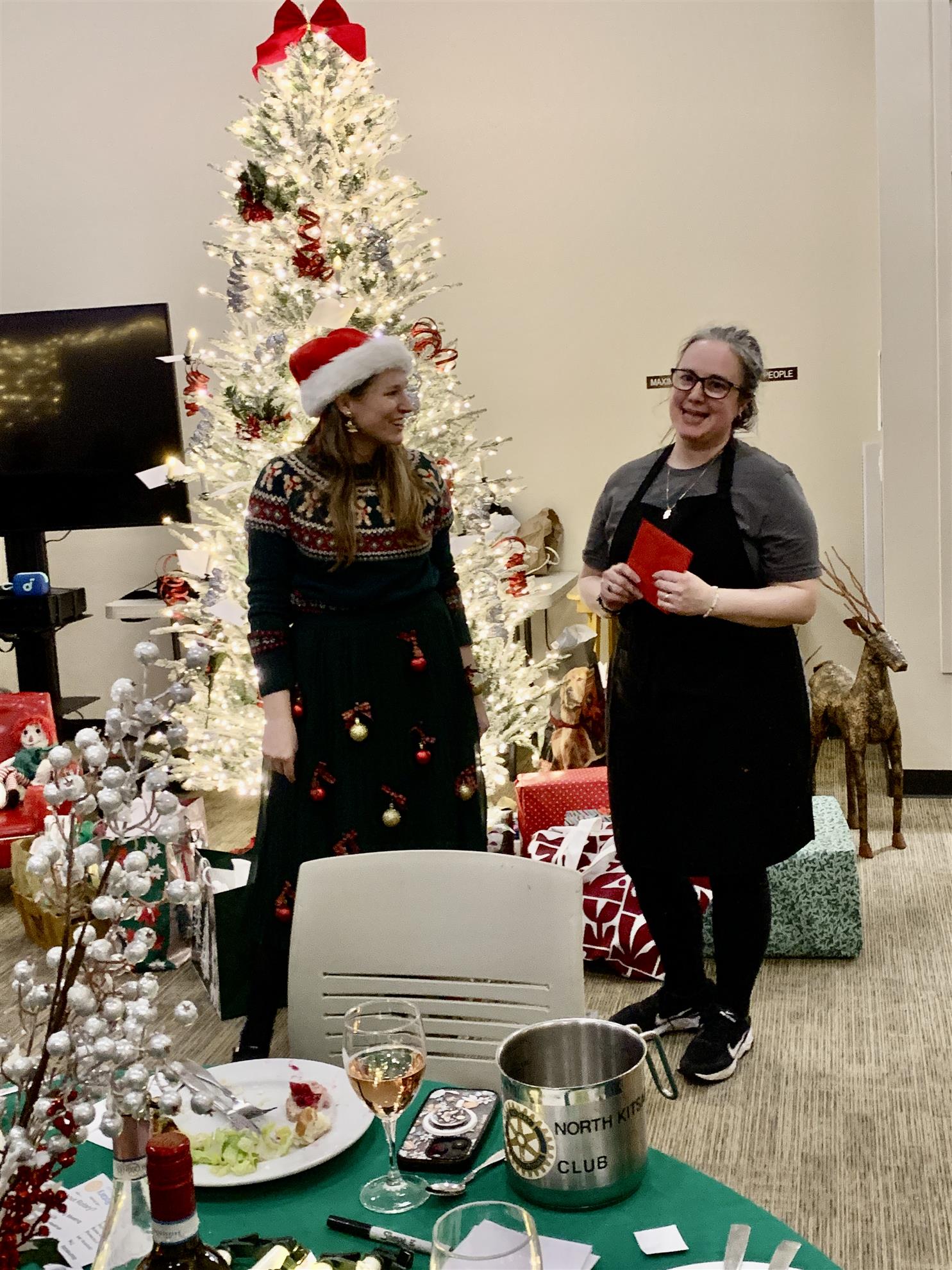 Co-Club Presidents Tim Carr and Emily Froula presided over festivities. Here, Tim wonders "what's this?" And Emily shows off her newly-acquired waders in the white elephant gift exchange. A giving tree, to benefit Kingston's ShareNet food bank, received many donations. Always giving, those Rotarians.
