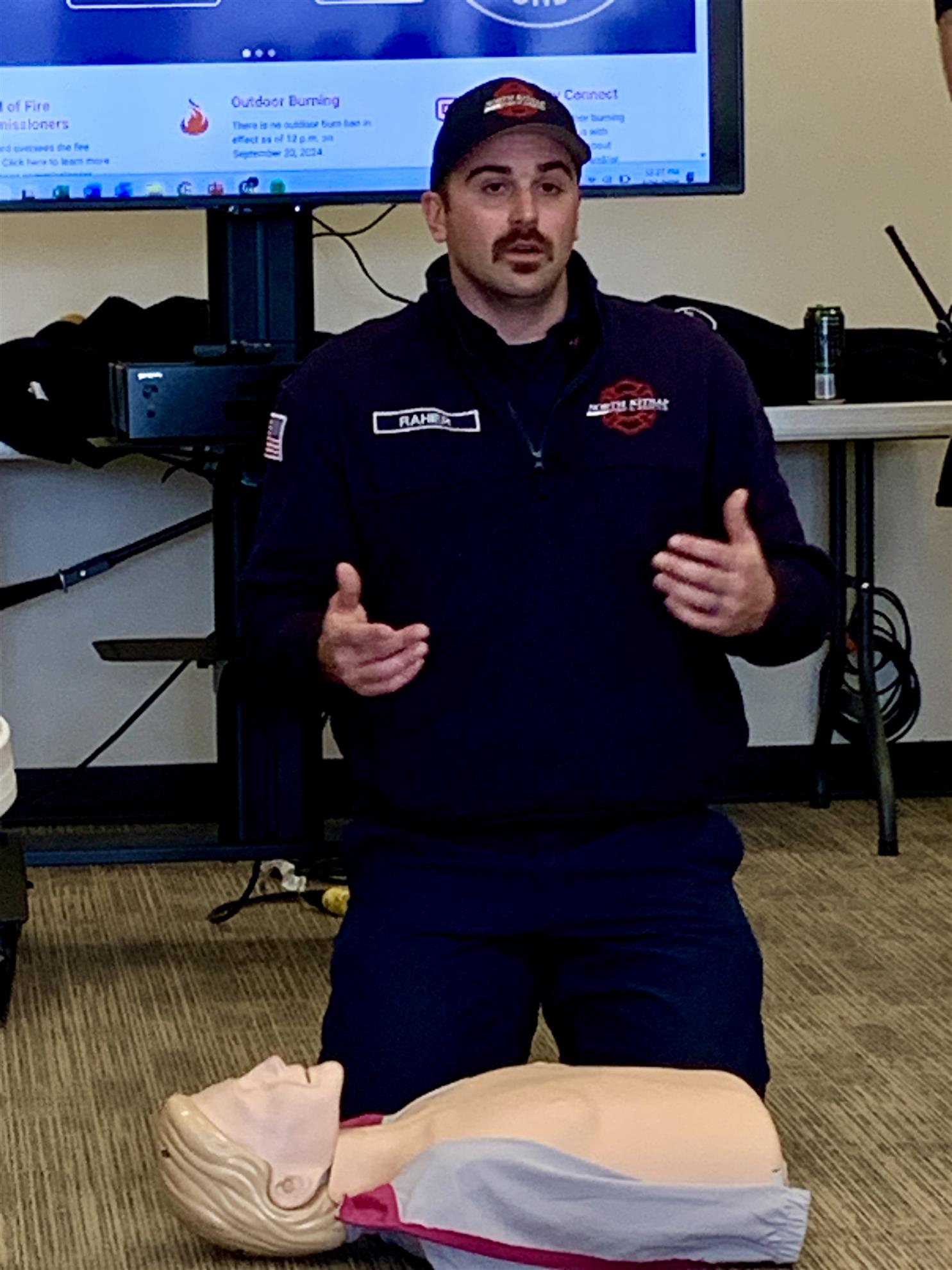 Michele turned the training over to NKFR EMT Lead, Theron Rahier, who outlined the importance of CPR before EMT's arrive. He said the chances of losing someone in distress goes up ten percent for every minute CPR is not performed.